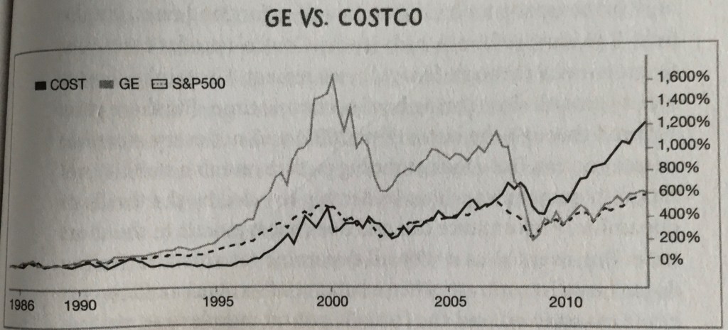 Sinek compares the vaunted GE (Jack Welch), up or out / rank em yank em people policies to those of Costco. GE grew faster (at first) but ended up tracking the S&P which means it had ‘average’ leadership. Costco started slower and outpaced the market without brutality to the circle of safety.